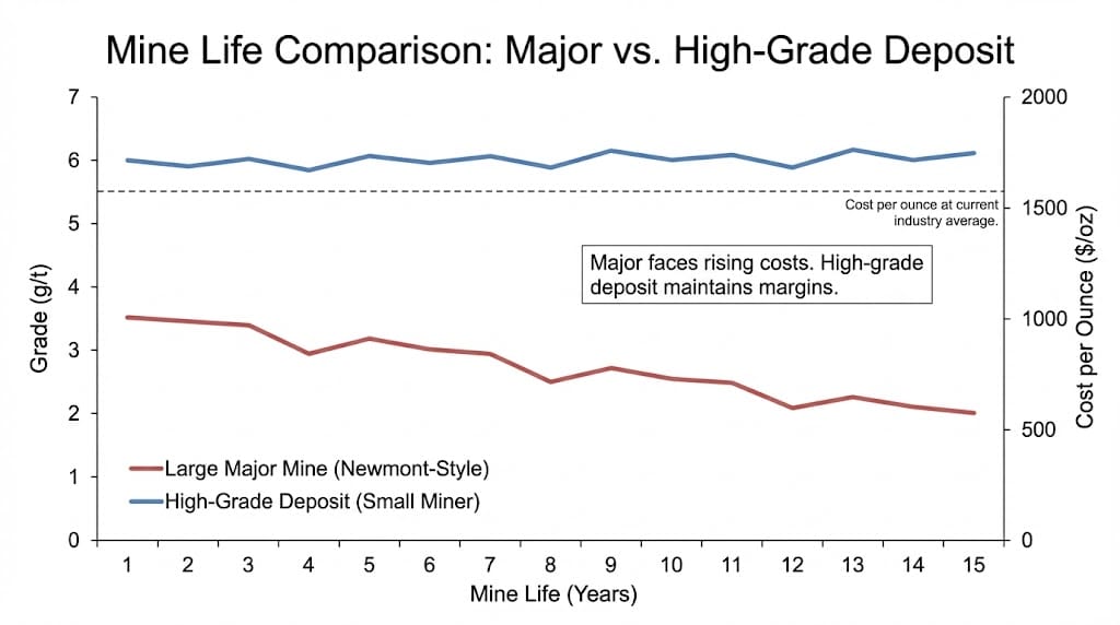 This is where the asymmetry emerges: smaller miners with high-grade deposits do not face this problem. A junior miner operating a 6.0 g/t deposit with a simple open-pit mine and a portable mill can generate astounding margins at current gold prices. A major miner processing 2.0 g/t ore with legacy infrastructure must fight for every percentage point of cost reduction.