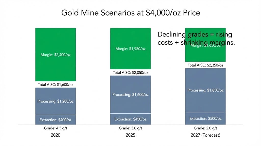 This is the structural reality of large hard-rock mining. Once you extract the highest-grade ore, you must dig deeper for lower-grade material. Your fixed costs (the minehead, the processing mill, the administrative overhead) remain constant while your ore tonnage declines. Your cost per ounce rises. Your margins compress.