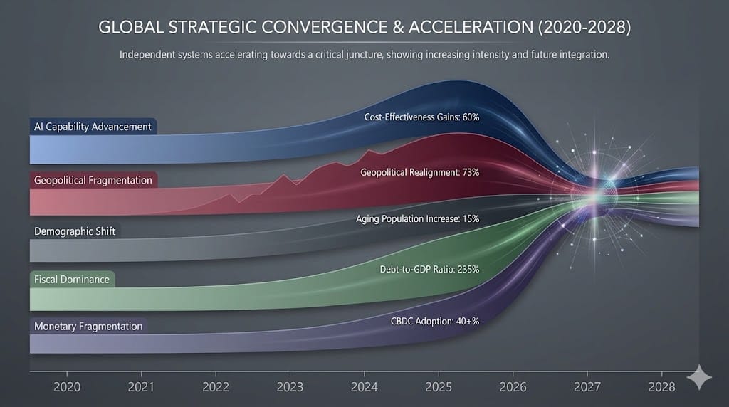 Each of these forces is real. Each moves at different speeds. But together, at a specific moment, they begin reinforcing each other. AI acceleration intensifies geopolitical competition. Geopolitical fragmentation constrains monetary flexibility. Fiscal dominance limits rate-setting independence. Demographic structure weakens the effectiveness of whatever rates are chosen.