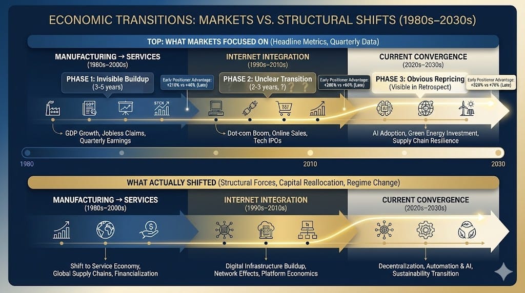 Nobody predicted the transition from manufacturing to services economies because they saw it happening quarterly. The transition occurred because capital, technology, and labor gradually reorganized. By the time it was obvious, entire regions had already been restructured.