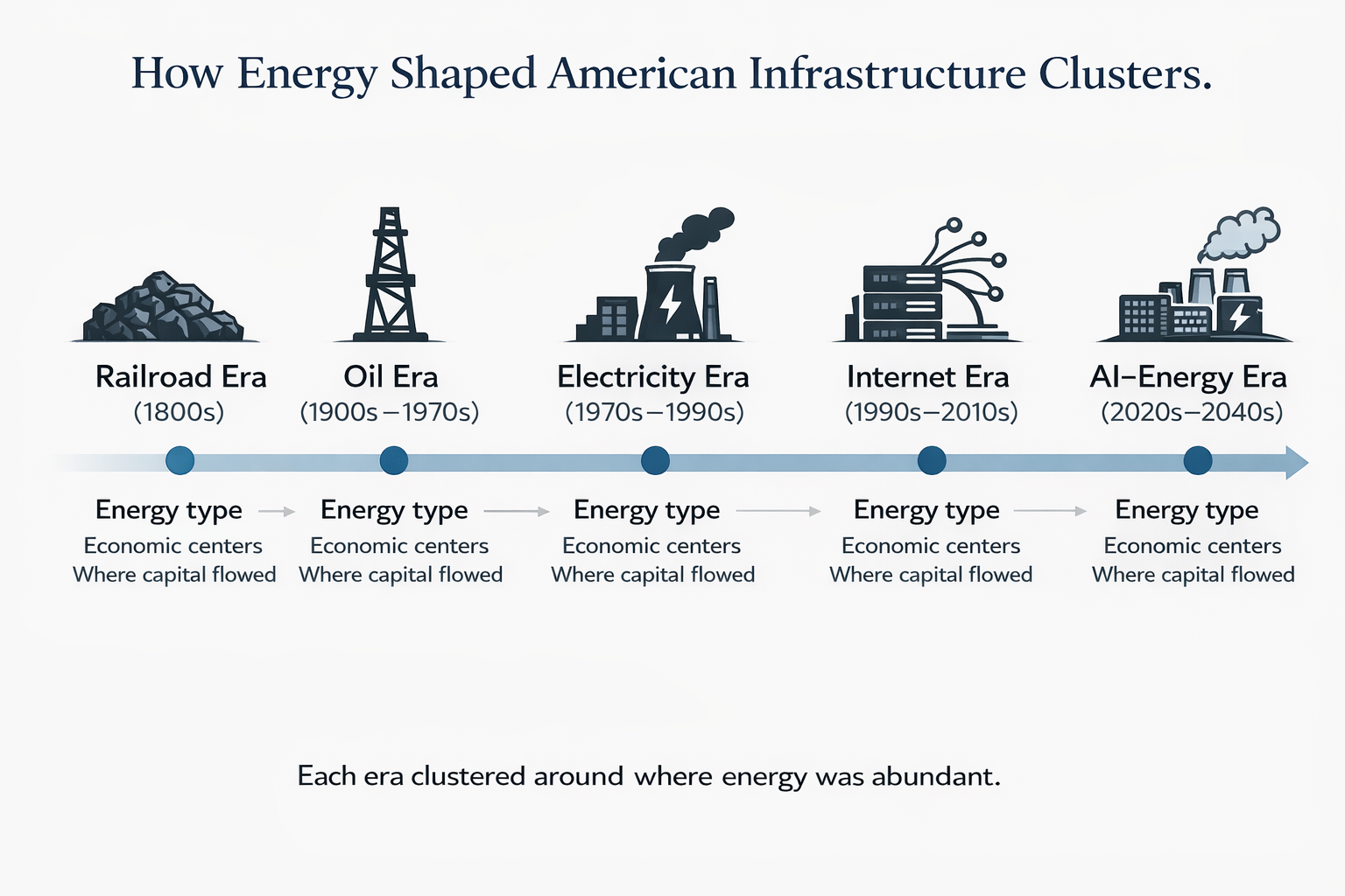 Throughout American economic history, energy infrastructure has preceded—and determined—where power concentrates next.
