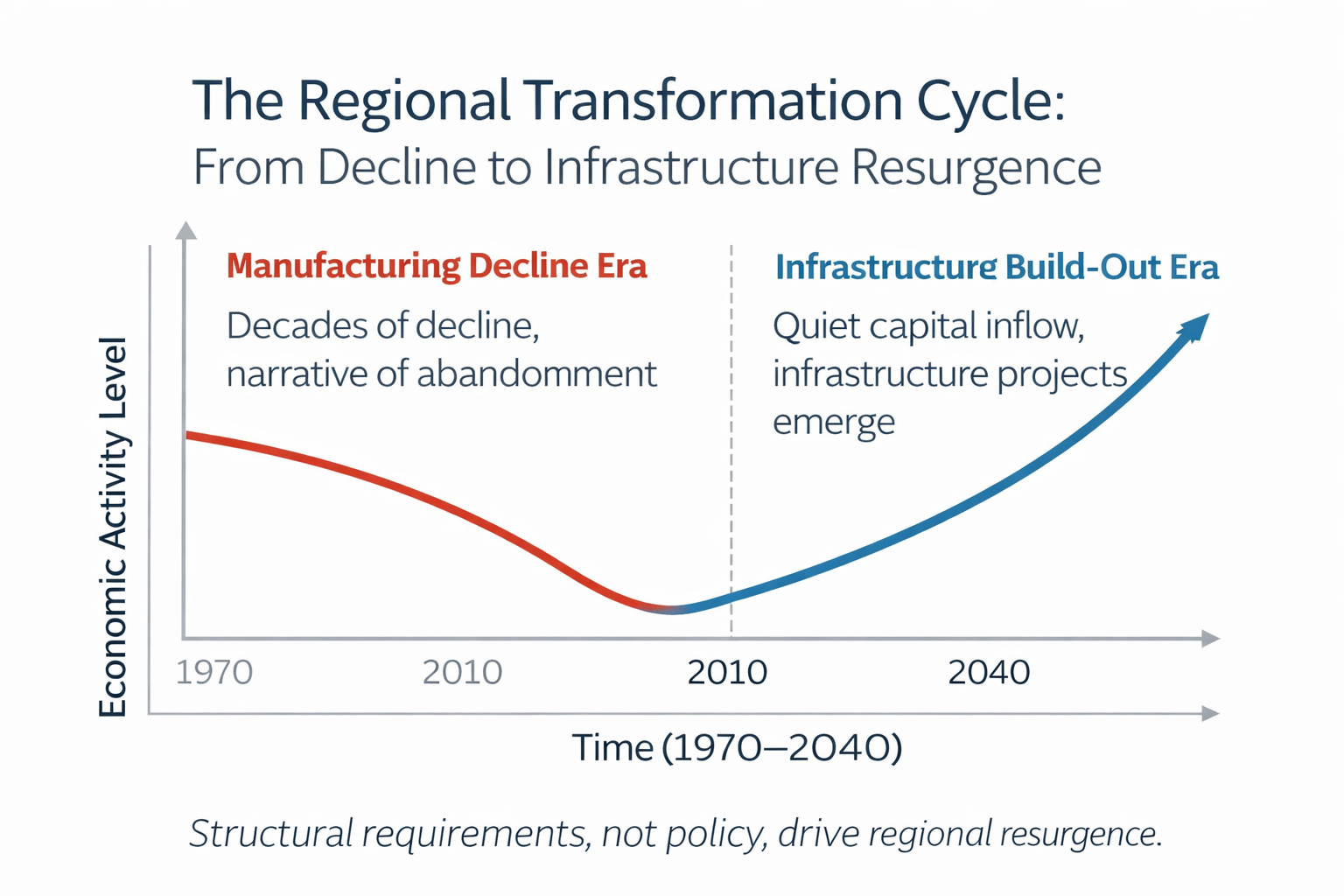 Then, almost imperceptibly, something shifts. Not out of sentiment or nostalgia, but because of structural requirements that only those regions can meet. Capital begins flowing back. New infrastructure starts being built. And the forgotten places re-emerge as central to the next era of national infrastructure.