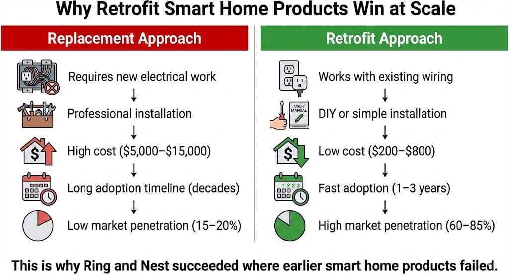 This is why Ring and Nest succeeded where earlier smart home products failed. They solved the retrofitting problem.