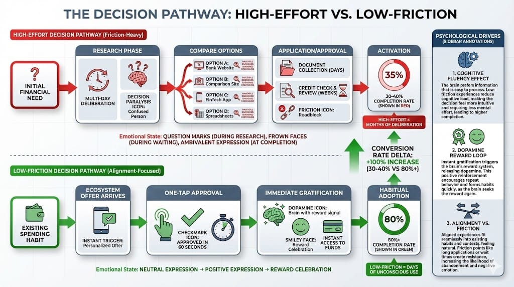 This is why instant application decisions matter. A decision made in 60 seconds, on mobile, with immediate gratification (approved!), feels different than an application that takes days. Speed makes the decision feel low-risk, even if the underlying credit terms are identical.