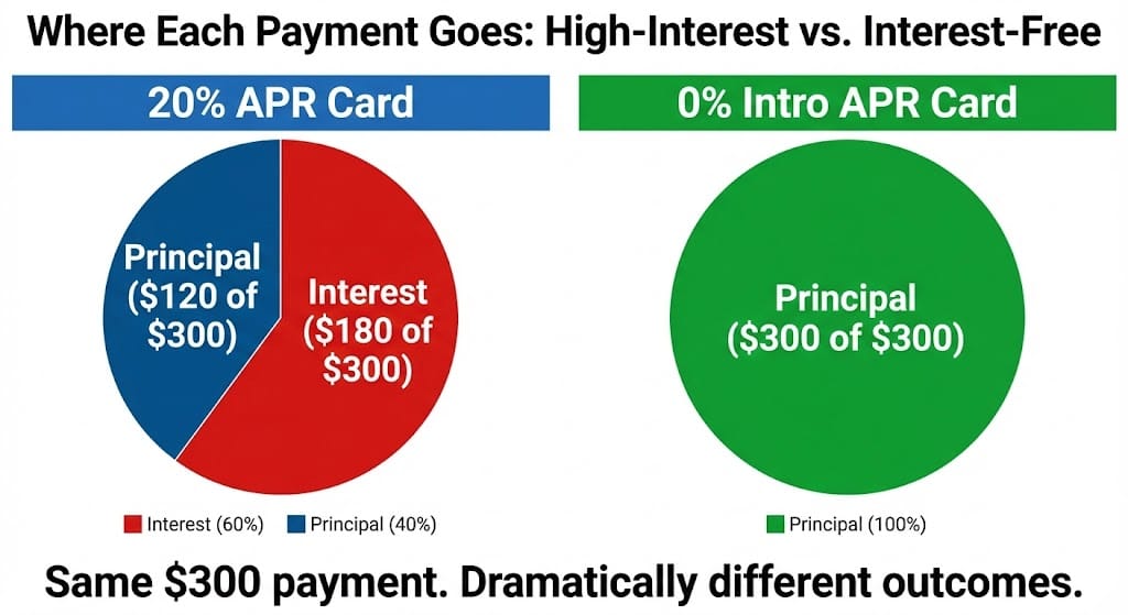Most financial advice tells you to stop spending. But if interest is consuming half your payment, spending is almost secondary. You could cut spending to nothing and still barely move the needle. The real problem is the rate at which time converts money to interest charges.
