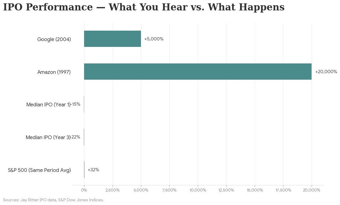 What is almost never discussed is how many IPOs from the same years produced no such outcome. For every Google, there were dozens of companies that went public, traded sideways for years, diluted their shareholders, and eventually faded from memory. Survivorship bias is not a footnote in this conversation. It is the conversation.