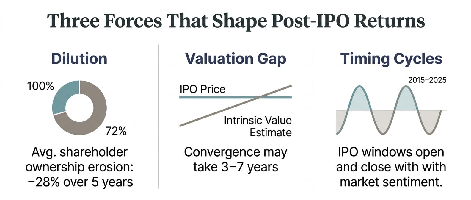 Dilution. Companies that go public often continue issuing shares — to raise additional capital, to compensate employees, to fund acquisitions. Each issuance reduces the ownership percentage of existing shareholders. Over time, dilution can quietly erode returns even when the stock price appears stable.