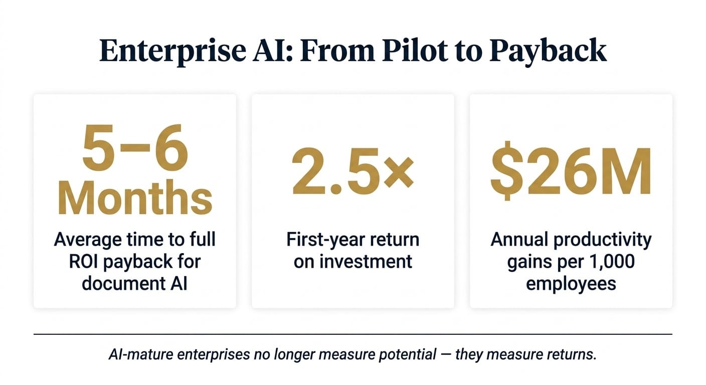 Document AI implementations, for instance, reach full ROI payback in five to six months, with an average return of 2.5x within the first year. For a 1,000-person company, annual productivity gains translate to roughly $26 million in recovered value at standard knowledge-worker rates.