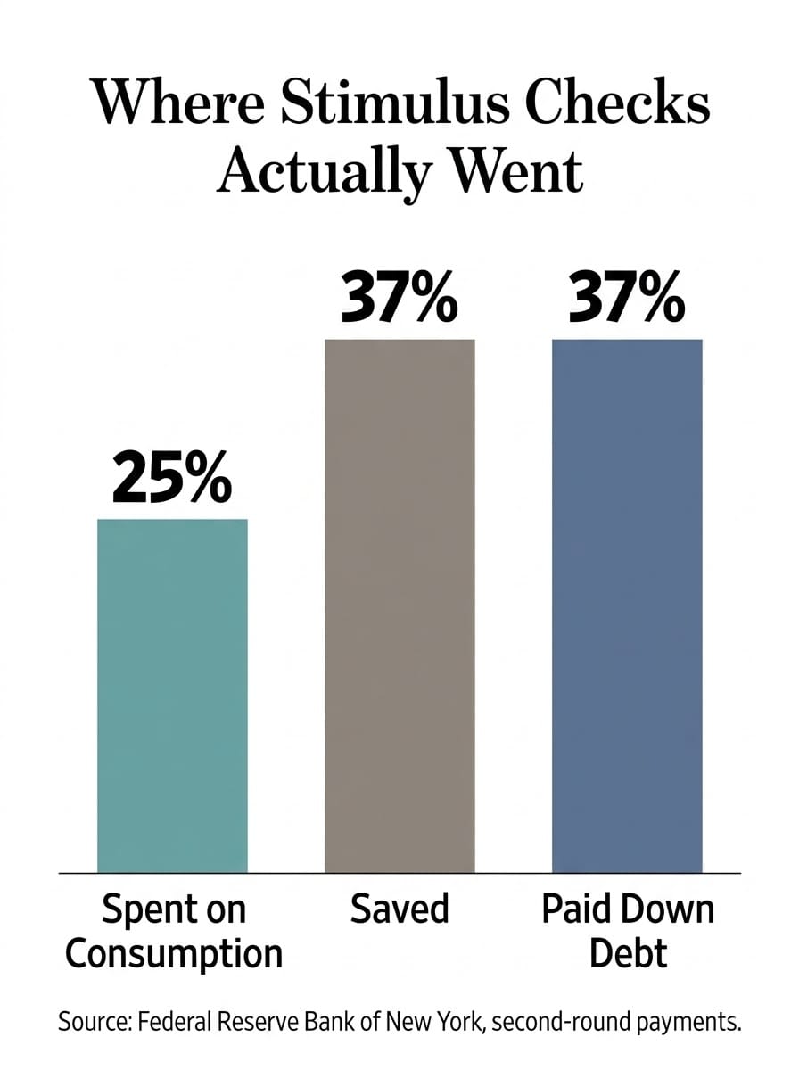 Federal stimulus checks serve a real purpose: economic relief during acute distress. Research from the Federal Reserve Bank of New York found that for the second round of COVID-era payments, respondents reported spending only about 25% of the total, while roughly 37% went to savings and 37% to paying down debt. A University of Chicago study reached similar conclusions—only about 15% of Americans reported spending most of their stimulus checks, with half using them to reduce debt.
