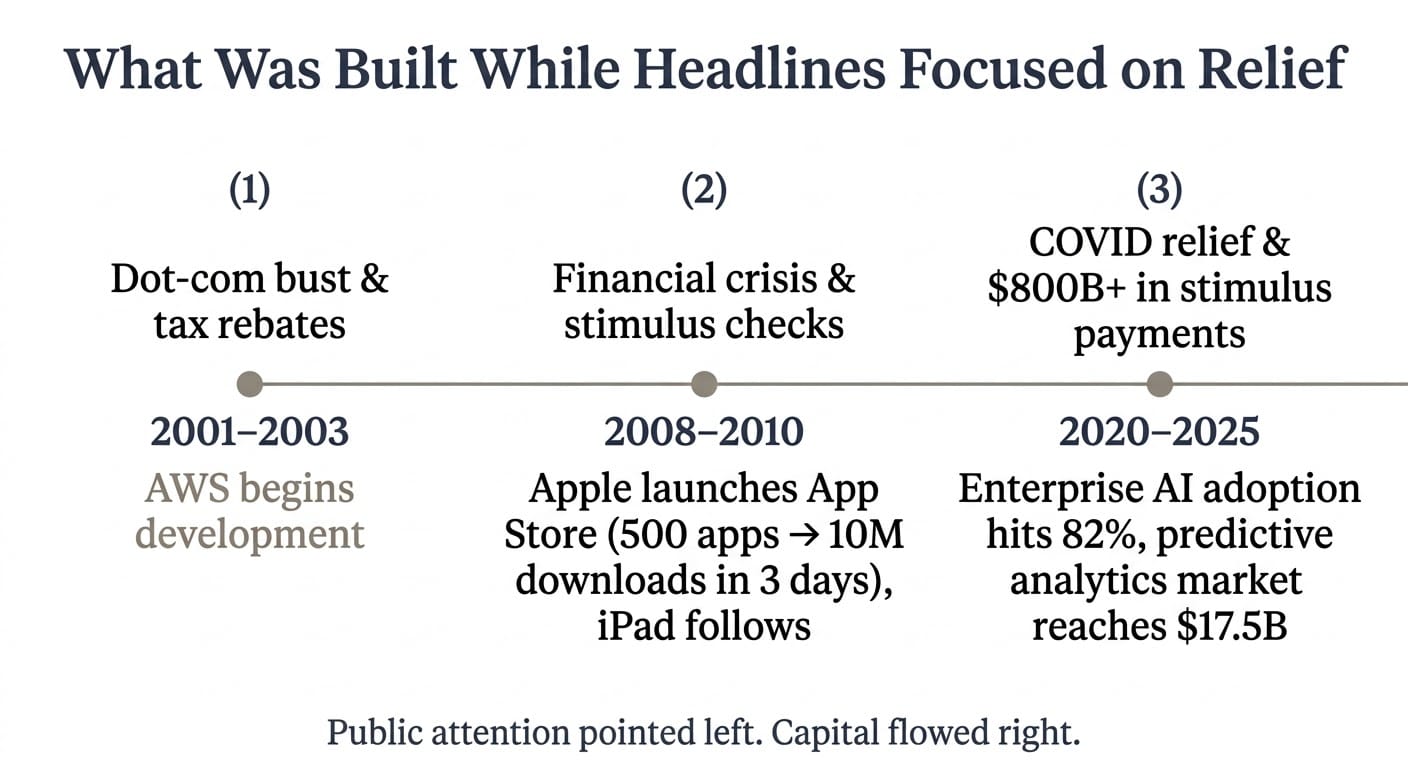 These windows share a common feature: they are open widest when public attention is directed elsewhere. The debate about checks and relief is important. But it tends to absorb the bandwidth that might otherwise be used to understand where the next structural layer of productivity is forming.