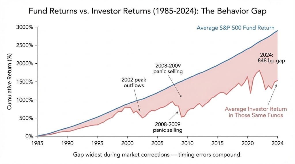 The data is now irrefutable after four decades of continuous measurement. The DALBAR Quantitative Analysis of Investor Behavior tracks mutual fund investor behavior from 1985 to 2024. In 2024, the average equity investor earned 16.54 percent. The S&P 500 returned 25.05 percent. The gap was 848 basis points—the second-largest performance gap in the past decade.