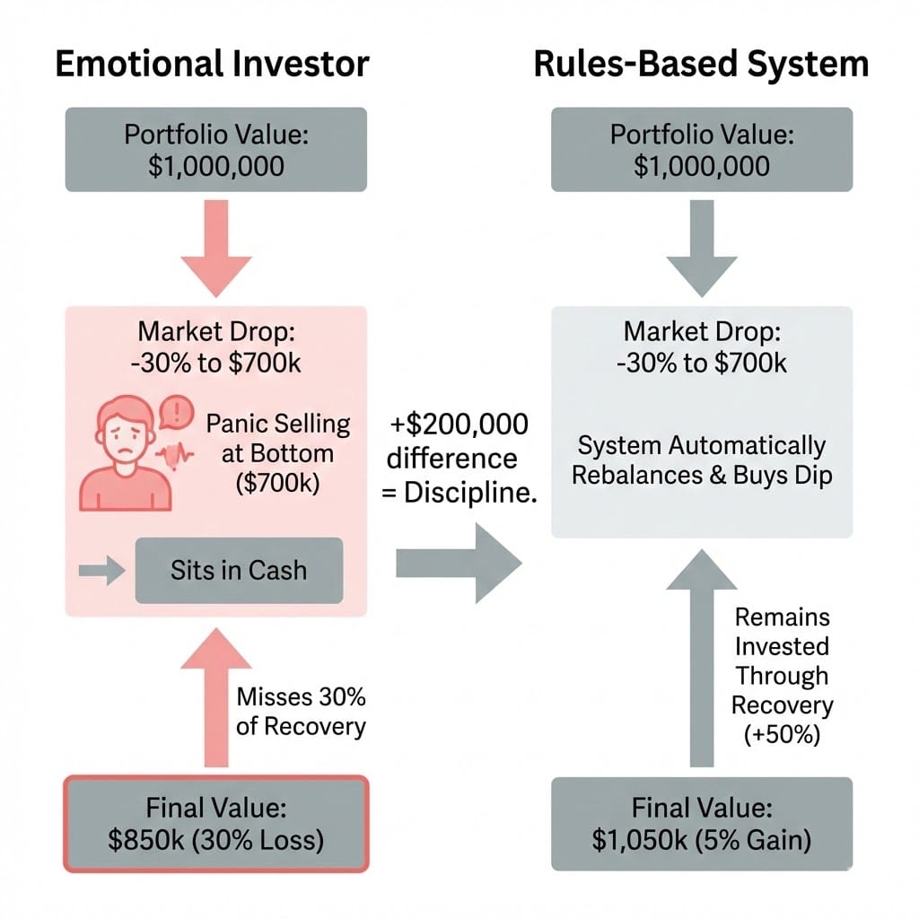 A rules-based investment system does not promise to outsmart the market. It promises to remove the investor from the decision-making process at critical moments. It says: "When X condition occurs, you will do Y action, regardless of how you feel about current headlines." This is automation not as a shortcut, but as a safeguard.