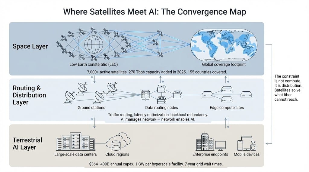 Space infrastructure and AI are converging because both are, at their core, distribution systems. AI distributes intelligence. Satellites distribute connectivity. The overlap is not philosophical—it is mechanical.