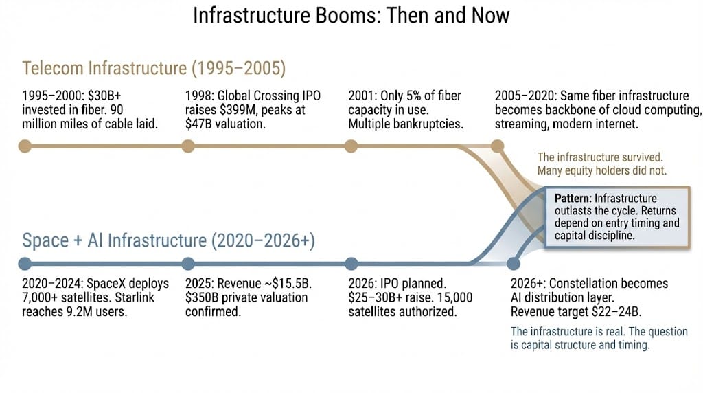 That is the cautionary parallel for space infrastructure tied to AI distribution: it can be strategically necessary and still financially mistimed. Retail investors often confuse these.