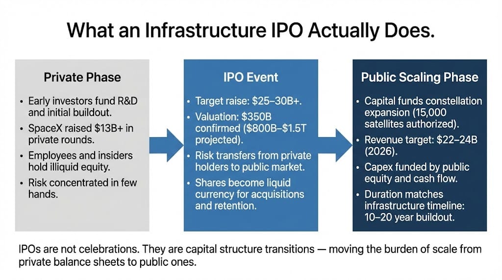 A private company can raise large sums. But public markets offer different advantages: deeper pools of capital, tradable currency for acquisitions, and a liquidity event that allows early investors and employees to rebalance. Importantly, an IPO also changes a company’s time horizon. Infrastructure businesses—satellites, launch cadence, ground stations, data routing layers—tend to be long-duration projects. They are expensive, iterative, and often front-loaded with capital expenditure. Public markets can become the steady funding mechanism that matches that duration.